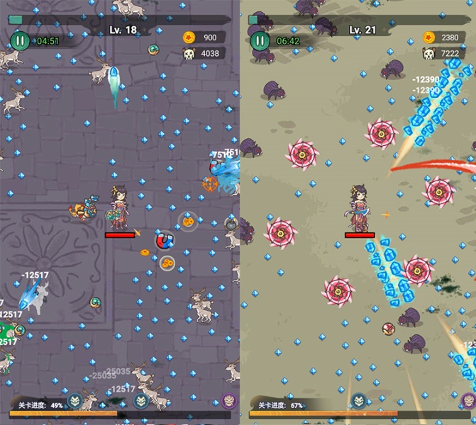 控制一名主角在一张平坦的地图上迎战不断变强的海量般的敌人,主角技能