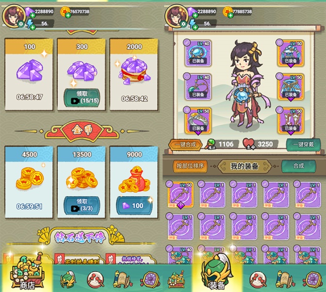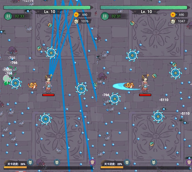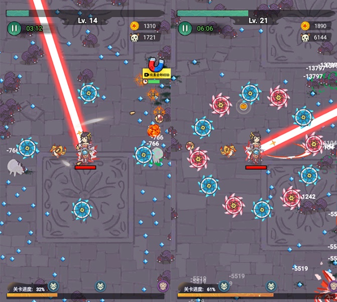 都是自动发动,玩家只要控制角色走位、拾取敌人掉落的经验和金币、在升